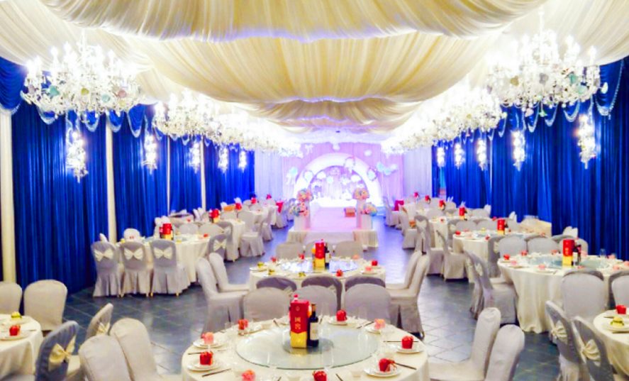 宴會廳可容納25桌,呈長方形,層高3.5米,有4根立柱,如果婚宴T臺較長的話會有點(diǎn)影響,起訂餐標(biāo)1399元/桌。